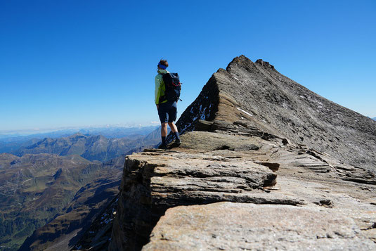 Vom Gipfel aus war der frisch angezuckerte Glocker zum Greifen nahe. Die Sicht war an diesem Tag aber allgemein fanastisch, das Bergemeer kaum zu überblicken.Am liebsten wäre ich noch für lange Zeit am Gipfel in der Sonne gesessen. Aber die Pflicht rief und so hieß es wieder zurück hinab nach Heiligenblut.